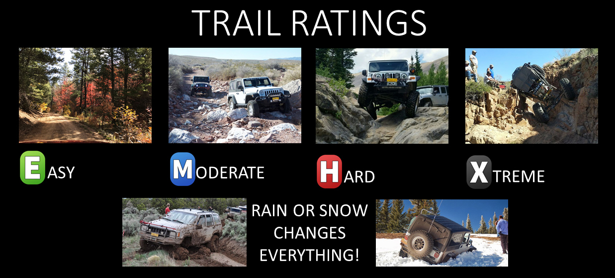 Trail conditions can change, and something that is hard for one driver might be easy for another, even if they are driving the same vehicle. A rainstorm might make an easy trail impassable, or a hard one easy.  So rating trails is tough. Be aware that conditions can change and the experience level of the person doing the rating may be different from yours. While we've tried to make this system useful, take these or any rating methods with a grain of salt - use our ratings as guidelines only.